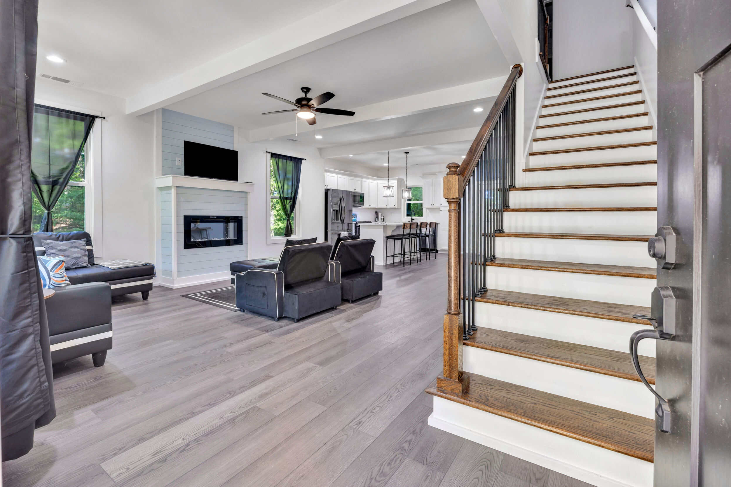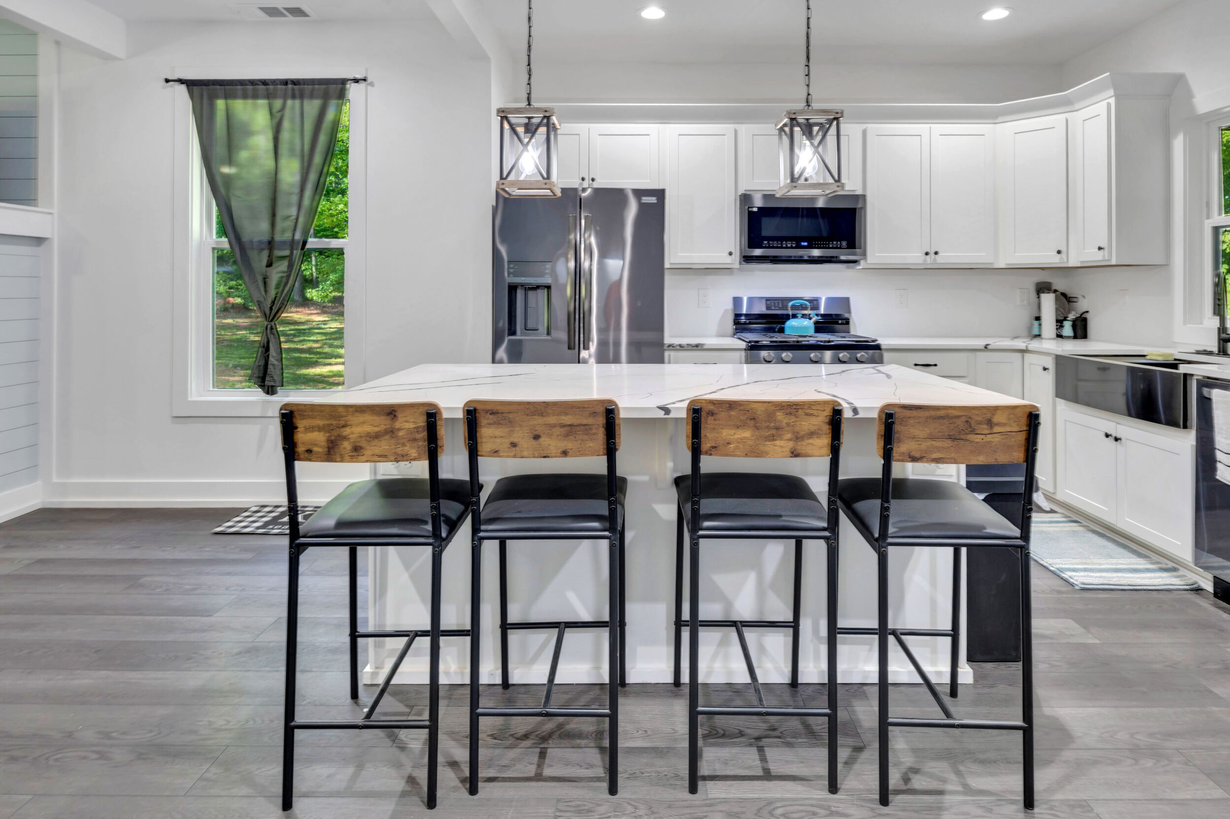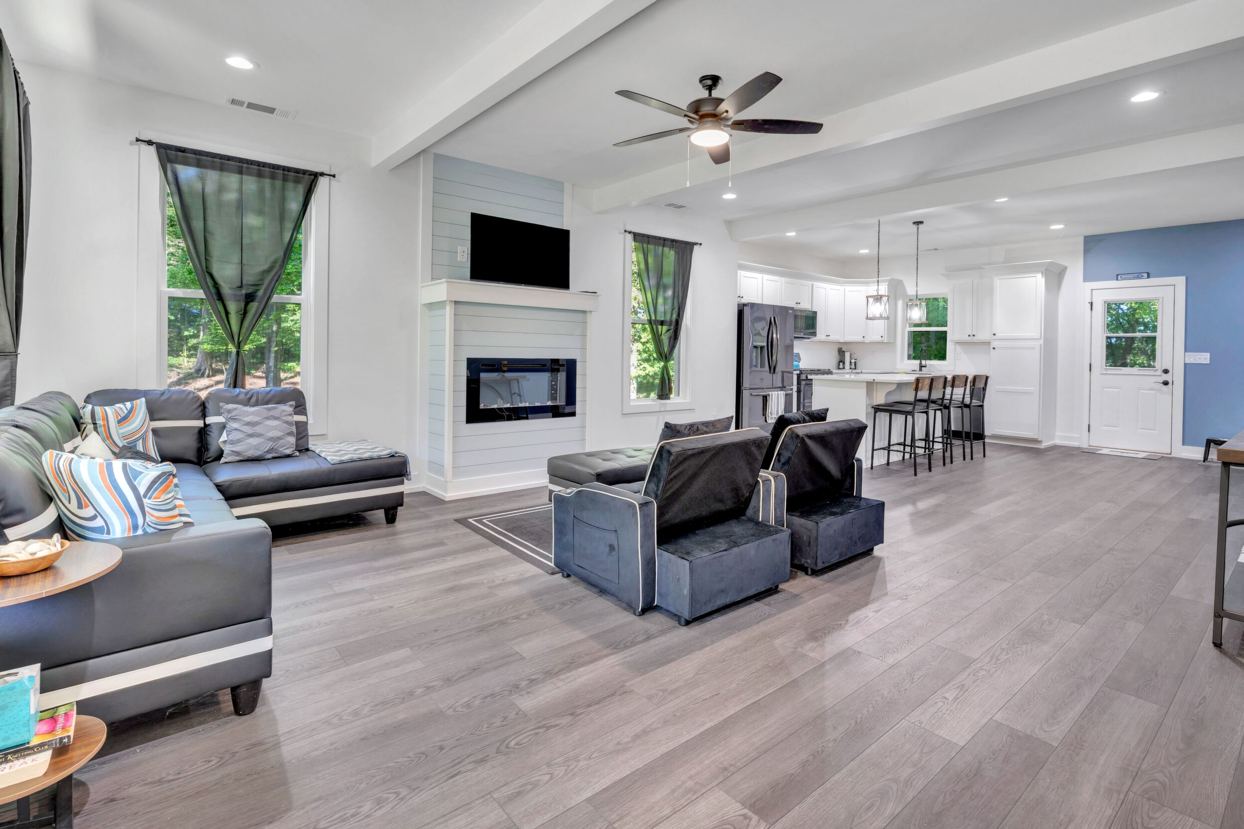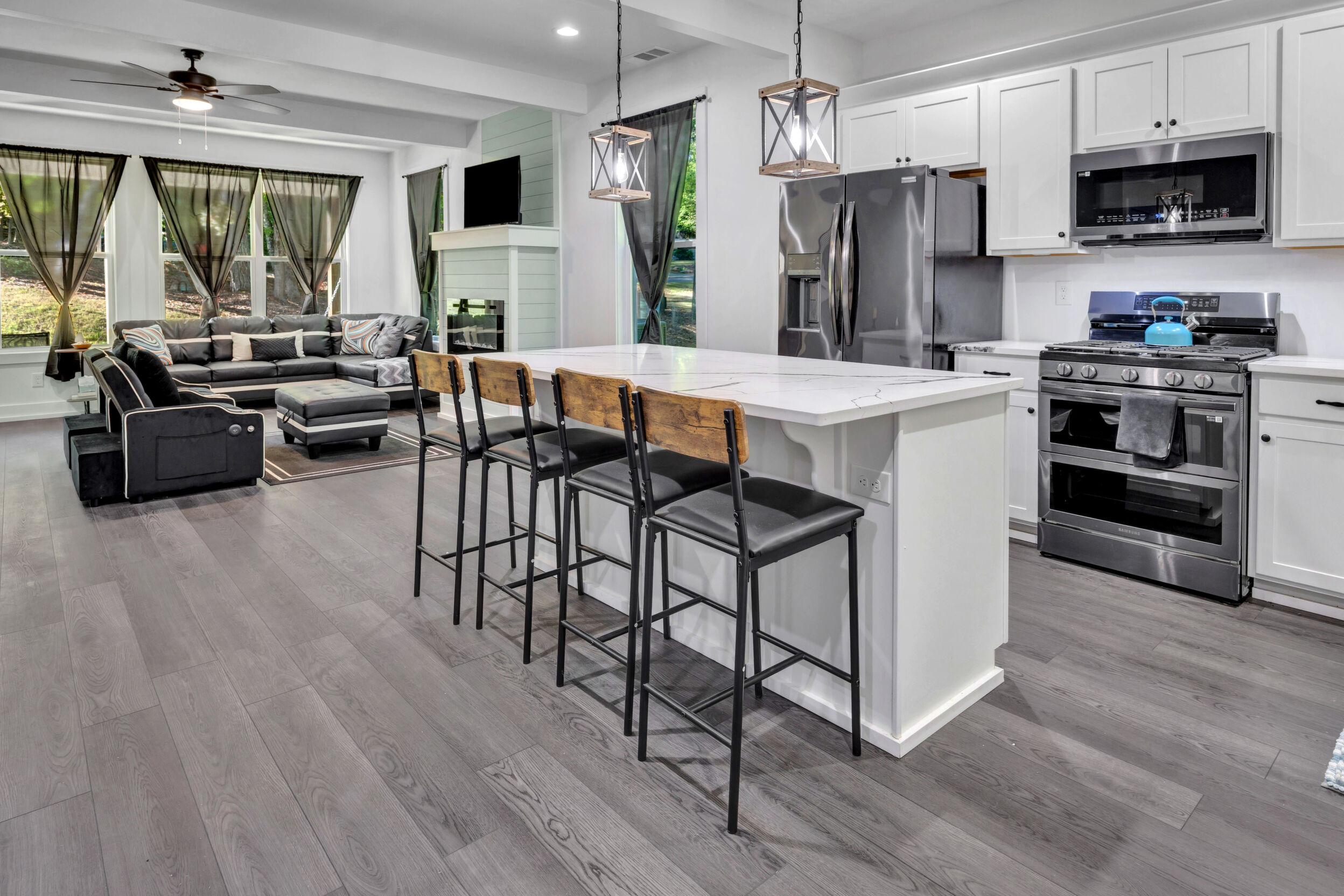 Beautiful classic craftsman two story nearly new construction home with 5-bedrooms & 3.5-bathrooms with seasonal views of the lake. This turnkey custom-built home on a double lot has direct access to Jackson Lake through the green space. The main floor of this home features LVP flooring throughout, custom electric heated fireplace & mantel, ceiling fans in every room, newer stainless-steel kitchen appliances all staying including the washer & dryer, dishwasher has never been used and all appliances are still under warranty, large kitchen island, quartz counter tops, oversized primary suite with walk-in closet, spa like ensuite with double vanity, linen closet and custom high-end wet room with a floating tub, floor to ceiling tile, dual shower heads including a rain shower head and heated bathroom/shower floors. Upstairs boasts heated floors throughout, dual zone HVAC, ceiling fans in every room, 4- bedrooms, a full bath with double vanity & a second ensuite with a full bath and ample closet space in the bedroom closets, The garage that includes remote doors and RV hook up has plenty of room for your automobiles and also includes a pet washing station with a full-size tub. Outside features fresh landscaping, outdoor lighting including sensor lights over the garage, rocking chair front porch, screened in porch in the back with ceiling fan and 30-50amp and large deck overlooking your private backyard with access to the lake. Other upgrades include a 12-ton dual zoned HVAC, 2 septic tanks in place for a total of 2700 gallons, plywood flooring in the attic for additional storage along with a gigantic storage area that runs behind the 2nd floor bedrooms that spans the entire length of the rear of the house, propane for the stove & there is also a 2/10 outlet for an electric stove hookup and leaf guards installed on all the gutters. The roof also has a 25-year warranty! You can fish, hangout & enjoy the peace of living near the water. All furniture can stay with an accepted offer! Owners may sell their amenities on the additional lot. Located in sought after Turtle Cove - Jackson Lake Community! Turtle Cove includes 5 white sand beaches some with boat ramps, pickle ball courts, golf, huge community pool partially covered with a full-service bar and restaurant.